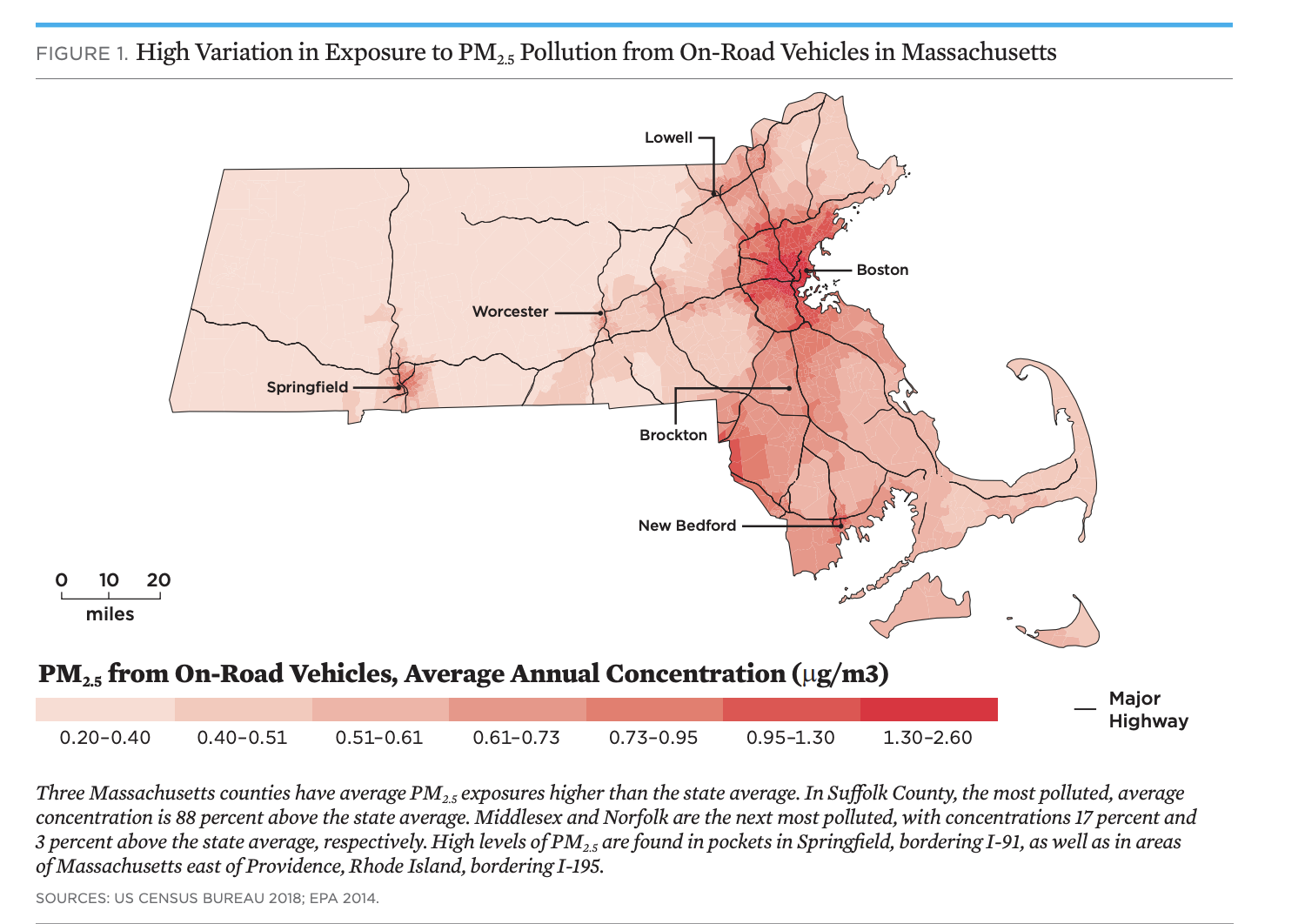 In 2019, a Union of Concerned Scientists (UCS) analysis showed that Asian American residents in Massachusetts “are exposed to PM2.5 concentrations from on-road transportation that are, on average 36 percent higher than the exposure of white residents.” Annually, 3 to 4 million deaths are attributed to air pollution from fine particulate matter; PM2.5 by itself is estimated to account for 95 percent of the global public health impact from air pollution. Exposure is associated with health conditions, including cardiovascular diseases, asthma, and slowed-lung function growth in children. In Massachusetts, worse air pollution is concentrated around downtown Boston, the I-93 and 95 corridors, and gateway cities such as Lowell. Boston’s Chinatown has the highest level of vehicle emissions of any neighborhood.