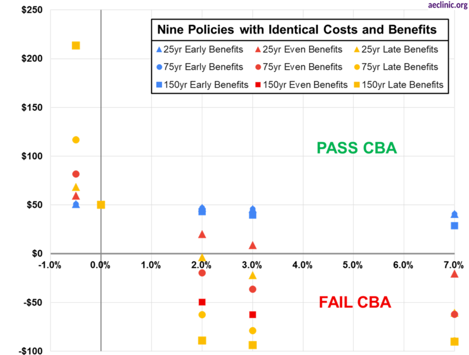 The July 2025 amicus brief drafted by AEC and submitted in Genesis v. EPA (summarized in an earlier blog post) compared nine example polices all with the same undiscounted benefits exceeding costs but different timing across five different discount rates. Policies with benefits occurring further into the future cannot pass a cost-benefit test with a positive discount rate, like the 2 percent used under Biden or the 7 percent currently used under the Trump Administration. Only a zero or negative discount rate allows for the higher (but future) benefits in these examples to outweigh the lower costs.