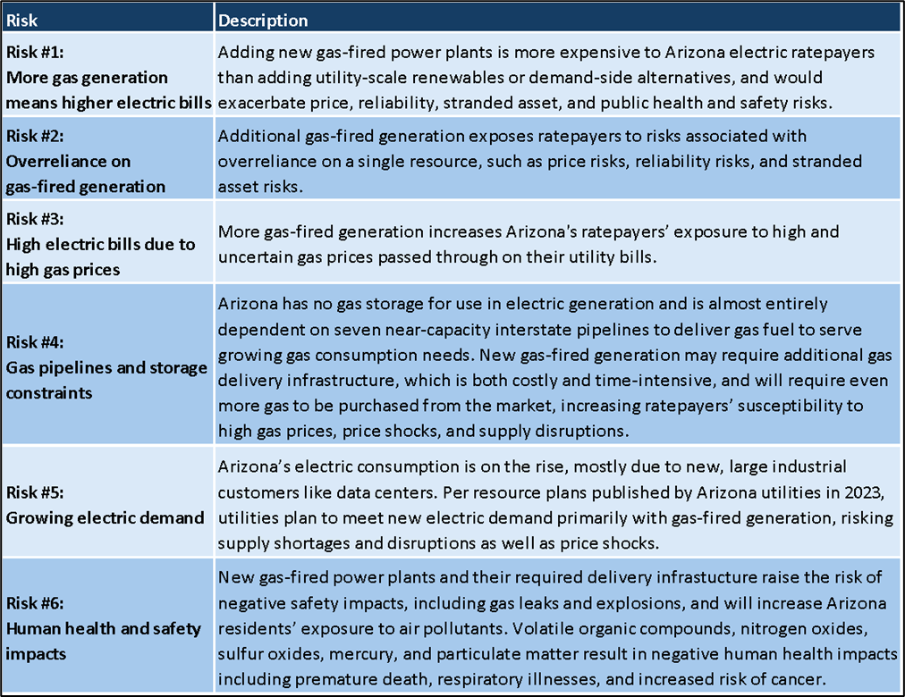 The report finds that Arizona’s electric sector is dominated by gas-fired resources and much more gas-fired capacity is currently proposed. Arizona’s utilities claim that new gas-fired generation is needed to address reliability challenges and meet anticipated growth in electric demand. However, the report finds that building new gas-fired generation hurts reliability and exposes Arizona’s residents and ratepayers to six serious risks: 1) More gas generation means higher electric bills; 2) Overreliance on gas-fired generation; 3) High electric bills due to high gas prices; 4) Gas pipelines and storage constraints; 5) Growing electric demand; and 6) Human health and safety impacts.